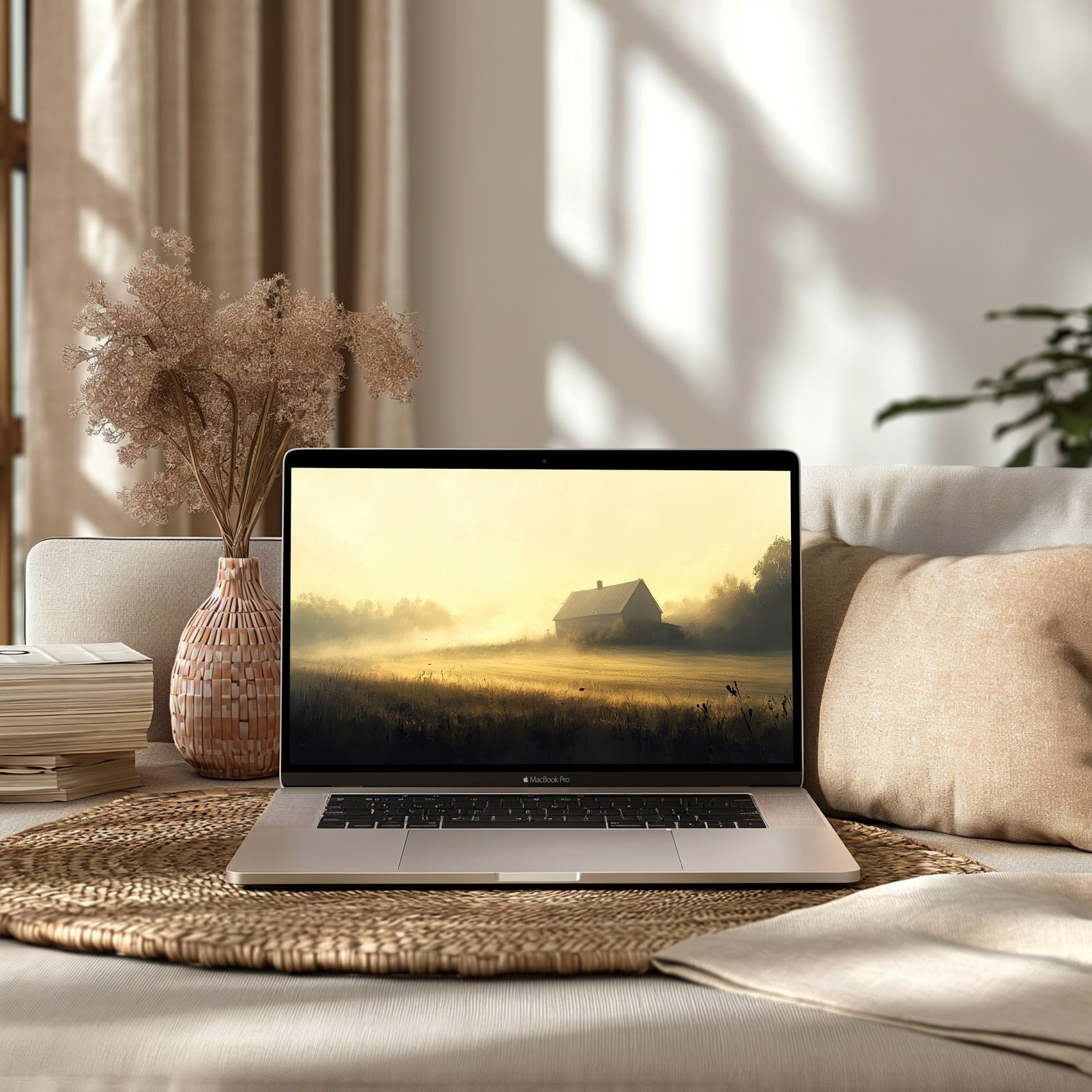Vintage desktop wallpaper digital download offers serene elegance with soft neutral tones and textured fields for PC or laptop use
