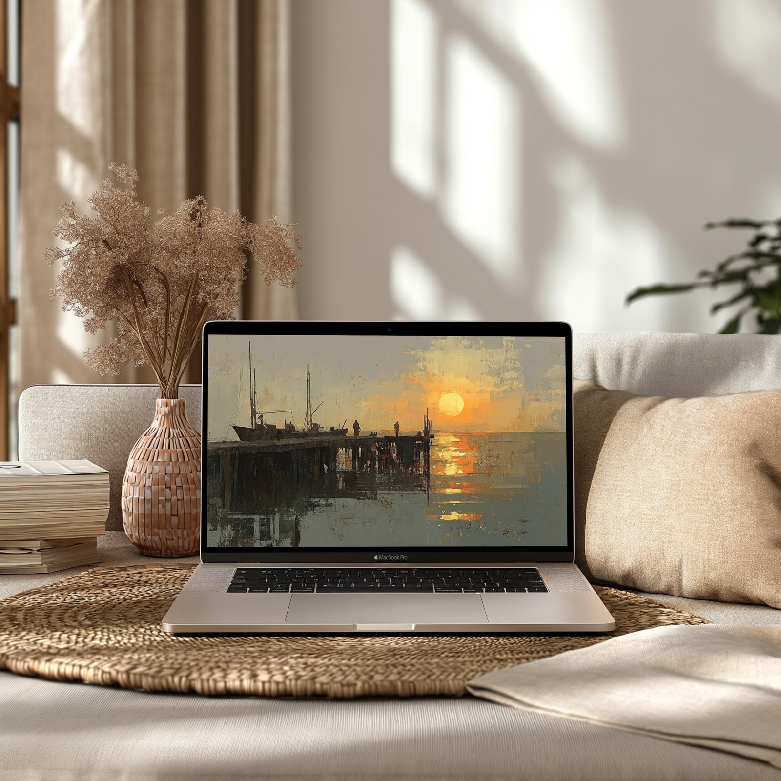 Featuring a refined palette of sandy neutrals, ocean blues, and golden sunlight, each wallpaper blends timeless elegance with natural calm. Perfect as a computer background for your home office or a 4K screen background for your workspace, this set enhances modern interiors with style and balance.