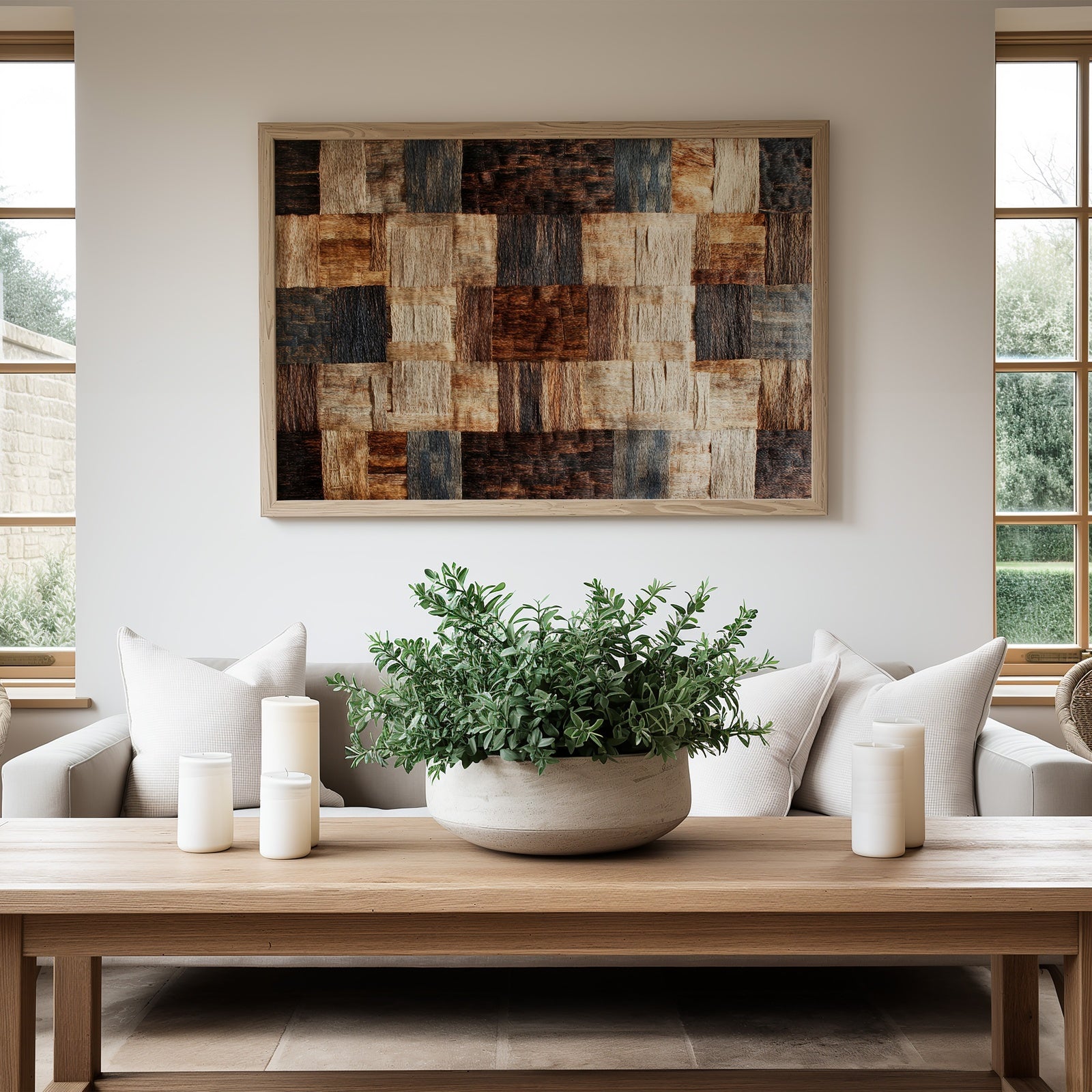 Invite calm and earth-toned warmth into your living room or bedroom with this boho printable wall art. Its rich patchwork of natural browns, creams, and charcoal creates an inviting rhythm that gently anchors any modern interior.